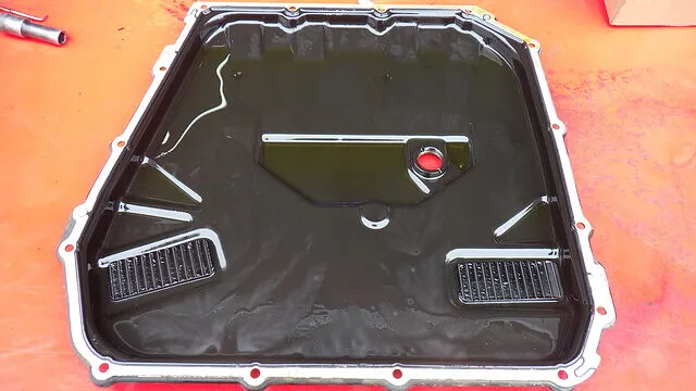 DSGミッションより取り外したオイルパン内部を確認します。