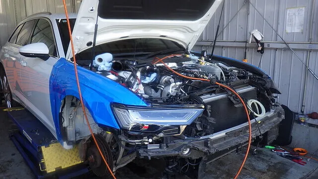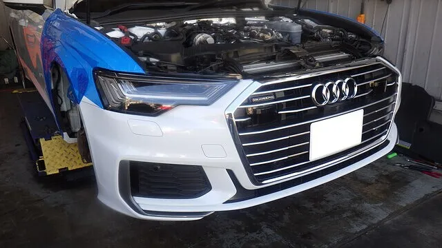 フロント廻りを分解し、サービスモードへ移行。 ラジエーターサポート・バンパー・補機類を取り外し、エンジン前面へアクセス可能な状態にします。 4A系アウディA6はスペースが限られているため、この工程を行うことでウォーターポンプ周辺の作業性を確保します。 エンジン前面が露出した状態で、漏れ箇所の最終確認を実施しました。