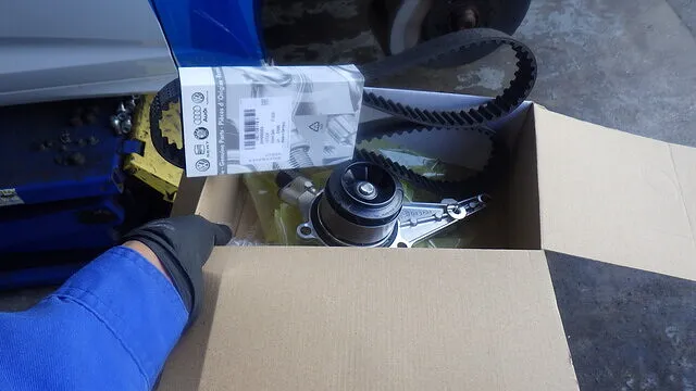 今回交換する新品ウォーターポンプおよびタイミングベルト。 ウォーターポンプは冷却水を循環させる重要部品で、内部シールやベアリングの劣化により水漏れが発生します。 取り外した旧ウォーターポンプはシール部からの滲みが確認でき、内部劣化が原因と判断。 新品部品へ交換し、ガスケット面を清掃後、規定トルクで確実に組み付けます。
