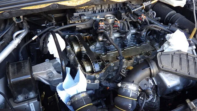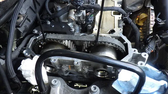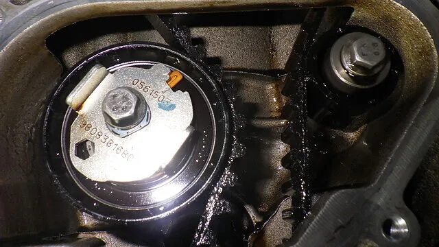EB2DTSエンジンは、サービスホールからタイミングベルトテンショナーの状態を確認できます。 分解前にテンショナー位置を目視確認。 テンショナーの指針位置が規定範囲内かどうかをチェックします。 湿式タイミングベルト構造のため、テンショナー状態はベルト張力管理の重要ポイント。 今回の車両では、分解前点検にてテンショナーの動作位置を確認後、タイミングベルト交換作業へ進みました。