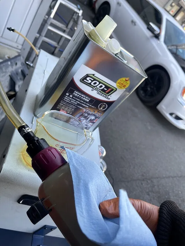 トルコン太郎でのATF圧送交換後、最後の仕上げにSOD-1plusを総油量の7%測ってシリンジを使って添加致します。