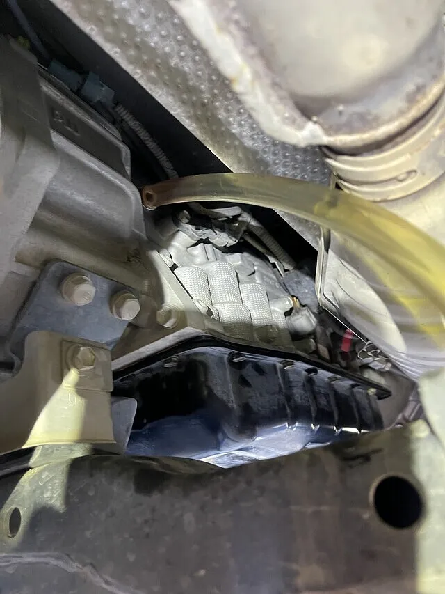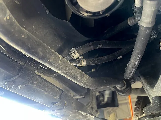 こちらの車両はクーラーラインがありますので、接続には困りません。トランスミッションからラジエター内部のクーラーまでホースで接続しています。こちらにトルコン太郎を接続し、交換を行っていきます。